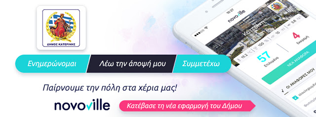 Τη δυνατότητα άμεσης και υπεύθυνης ενημέρωσης από τον Δήμο Κατερίνης μέσω της δωρεάν εφαρμογής Novoville, για όλα τα έκτακτα μέτρα στο πλαίσιο προστασίας της δημόσιας υγείας για την αντιμετώπιση του κορωνοϊού, καθώς και της απευθείας λήψης επικαιροποιημένων ανακοινώσεων έχουν οι 2600 δημότες – χρήστες του πολύτιμου αυτού ηλεκτρονικού εργαλείου διάδρασης Δήμου-Δημότη.